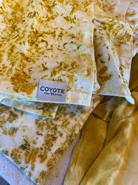 This ASC x Coyote Farm Hand Dyed Bandana is uniquely crafted with handpicked Marigold Flowers from Coyote Flower Farm in Hood River, Oregon. By steaming the flowers, a dye bath is created to color each tee individually, resulting in slight variations in pattern and color. Additionally, the tee is made from preshrunk 100% organic cotton.